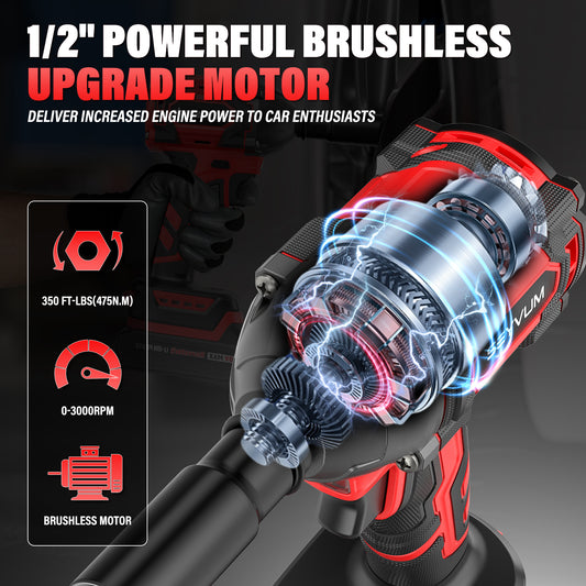 SEYVUM Cordless Impact Wrench, 20V Compact Brushless 1/2 Inch Impact Driver with 4.0Ah Lithium-Ion Battery and Fast Charger, 350 Ft-lbs(475 N.m) with 4 Pcs Sockets, Electric Impact Wrench for Car Hom