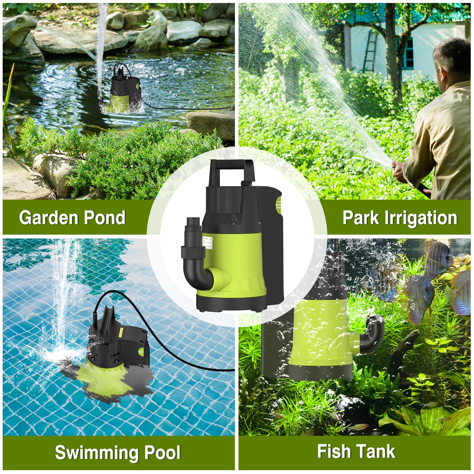 The submersible pump is equipped with a robust 1/2HP motor, capable of efficiently draining up to 2600GPH which sprays water up to 26 feet high. Additionally, the pump comes with 1 NPT elbow adapter, and Multi-hose Adapter fits 36mm, NPT1", and 26mm hose. Making it ideal for sump pump applications and pool draining.