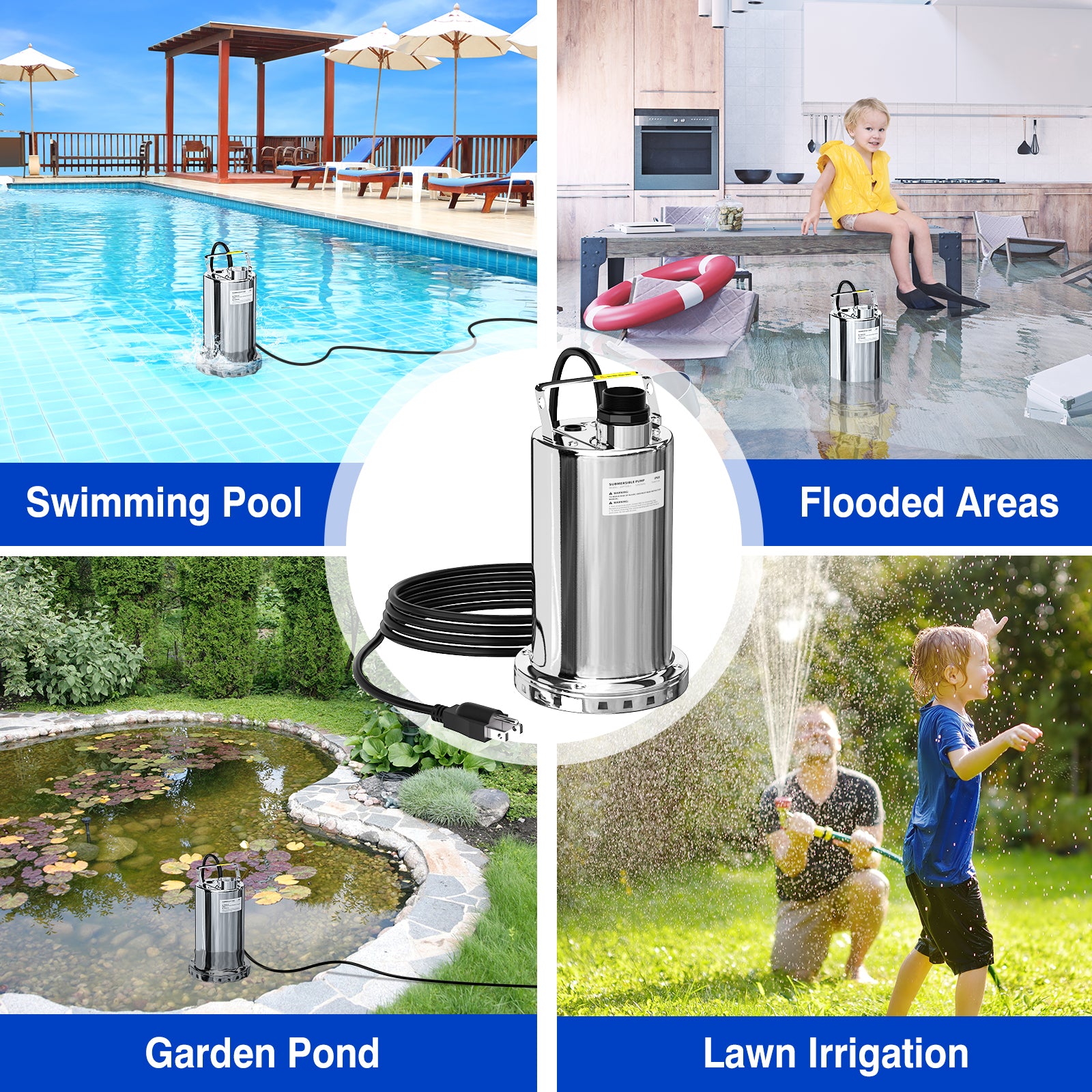 Equipped with a powerful 1HP motor, this submersible pump offers an impressive water flow rate of up to 3900GPH.Additionally, the pump comes with 1 NPT straight adapter, and a Multi-hose Adapter that fits 36mm, NPT1", and 26mm making it ideal for handling high-volume drainage tasks efficiently.