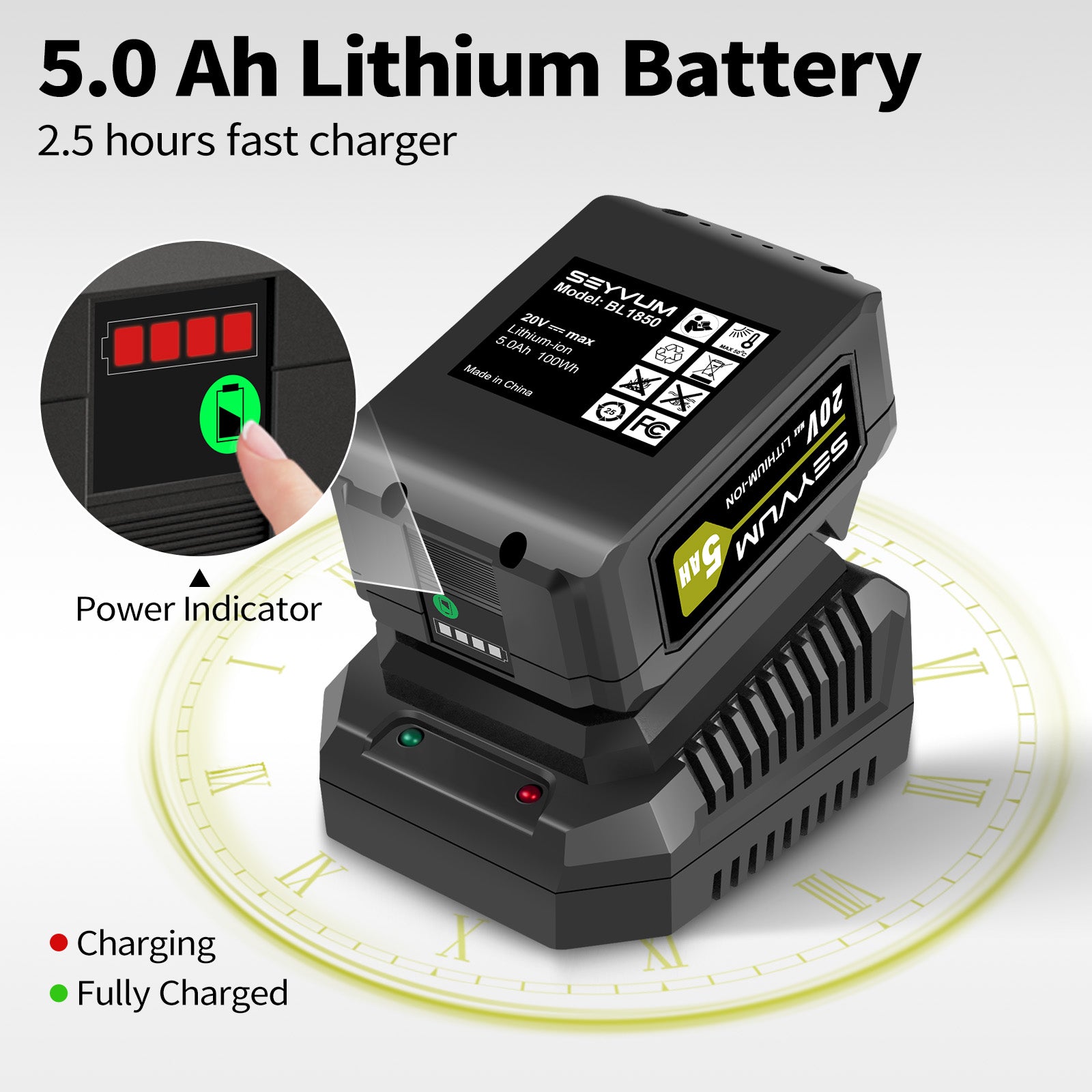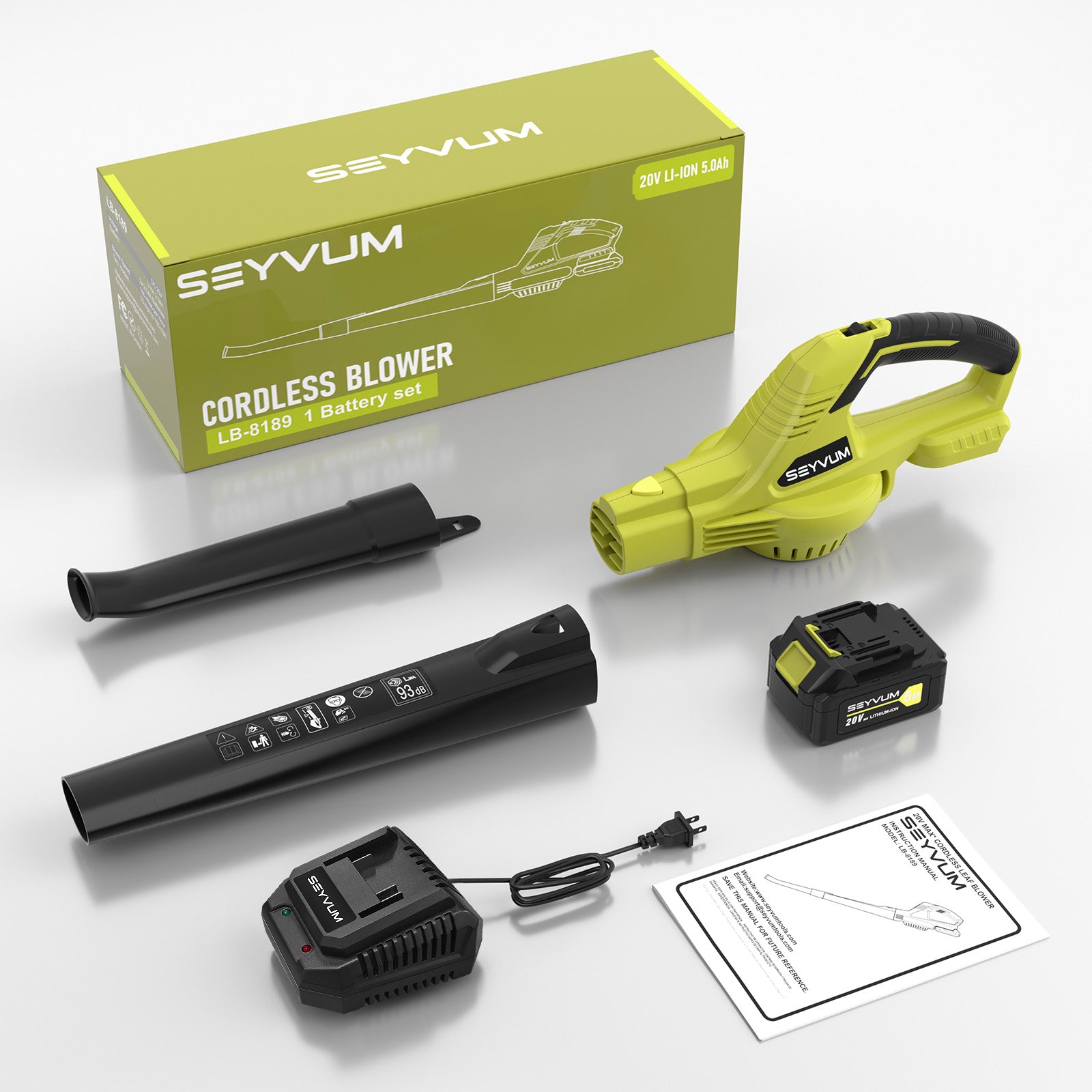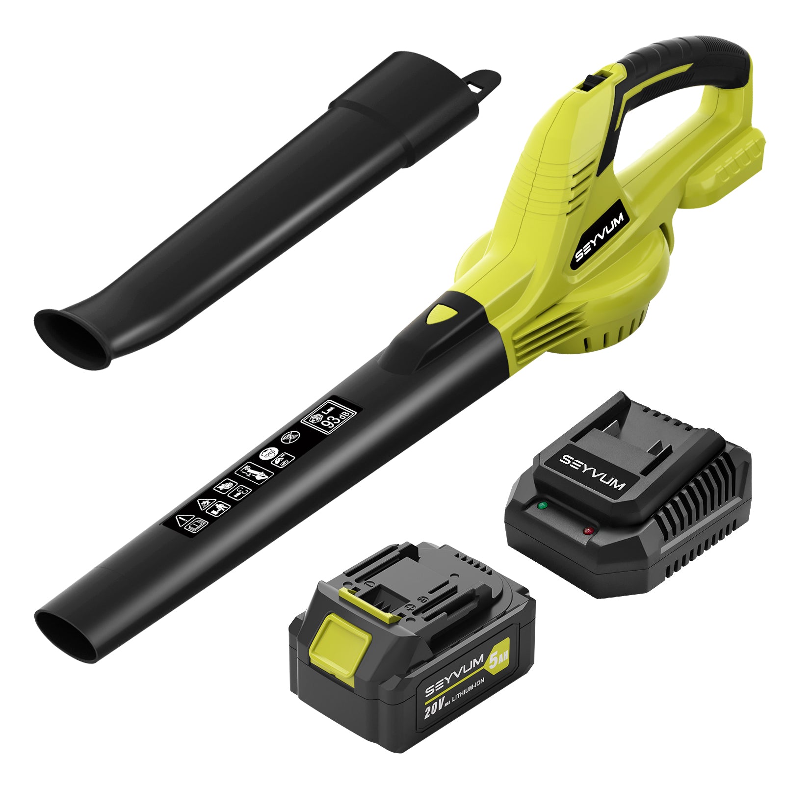 SEYVUM cordless leaf blower comes with a 5.0Ah lithium-ion battery and 2.5 hour fast charger. Up to 30 minutes working time with the 2 speed, and the 1 speed longer. Please make sure the battery is cool before charging.