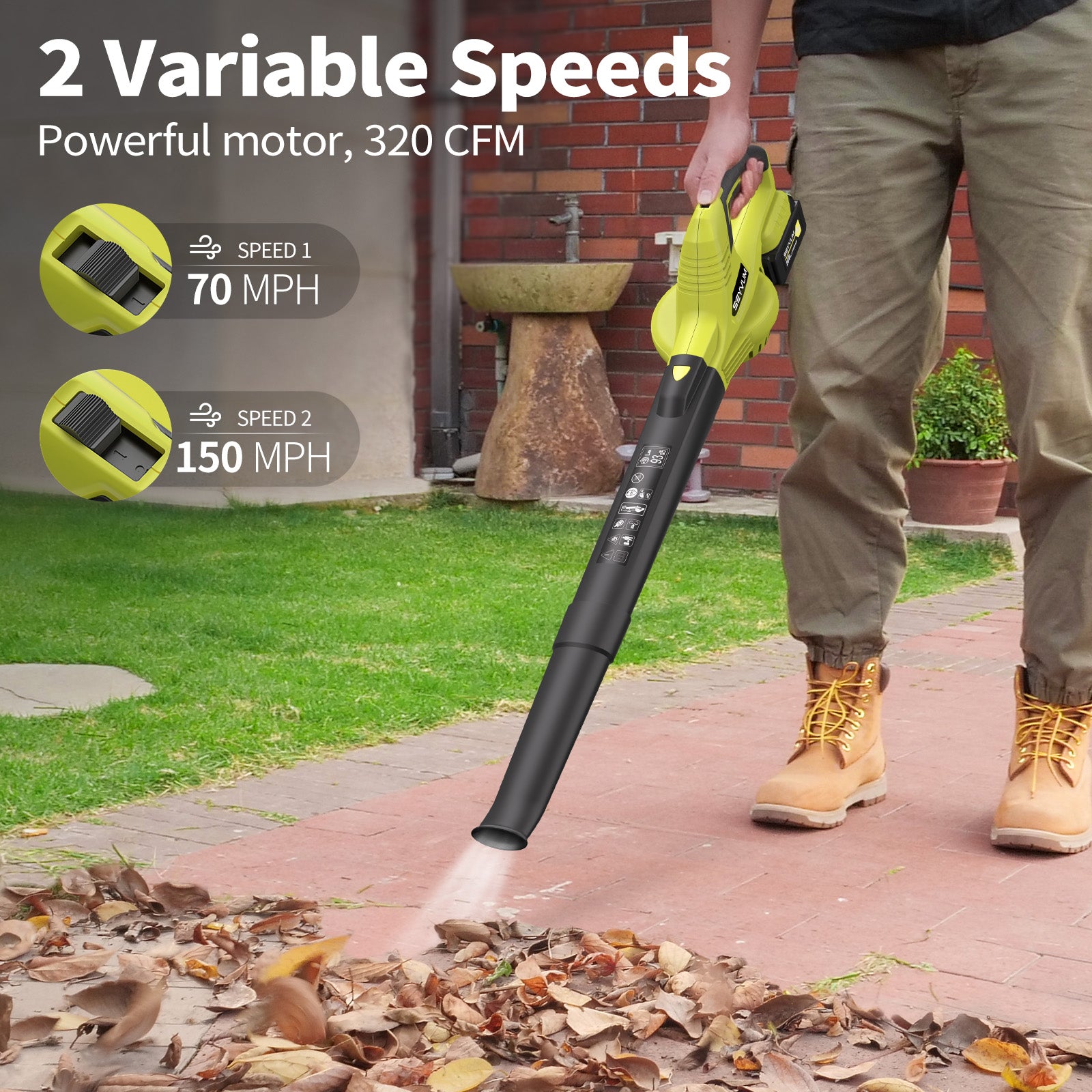 1 speed - 70 MPH, 2 speed - 150MPH, one button to adjust the speed, the electric leaf blower can easily move leaves, dust, and small rocks to meet all your daily needs.