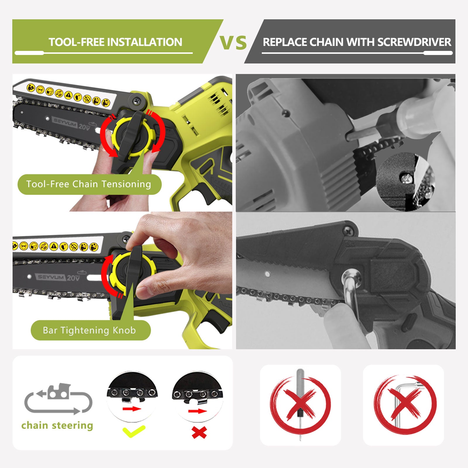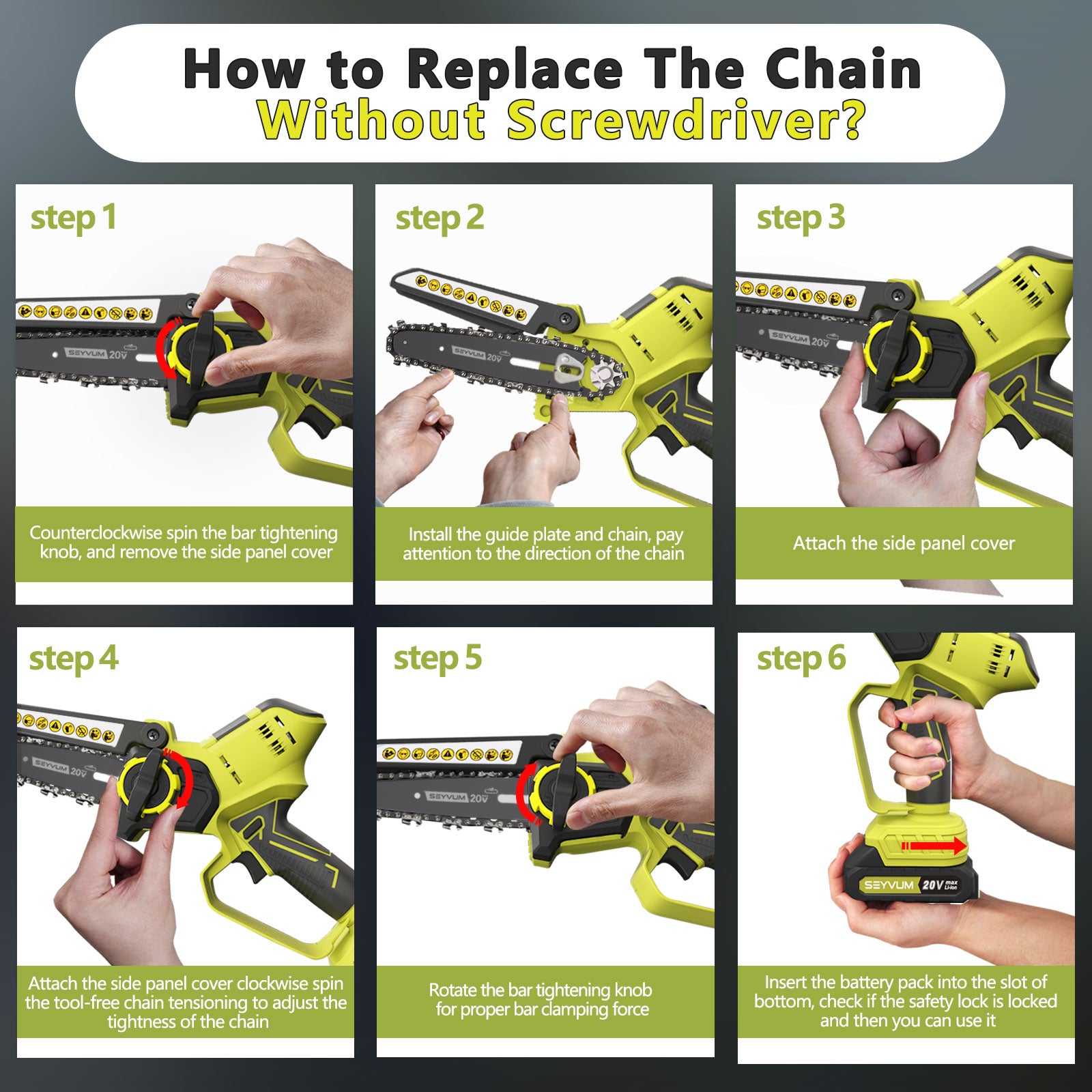 This mini chainsaw 6-inch cordless is almost ready to use right out of the box. You do not get fretted to use the tool, the chain and saw can be easily installed and replaced without the need to use any tools. SEYVUM mini cordless chainsaw comes with a tool-free design and a detailed and thorough English manual with picture descriptions step by step. For safety, please pull out the battery pack of the electric chain saw when not in use.