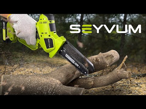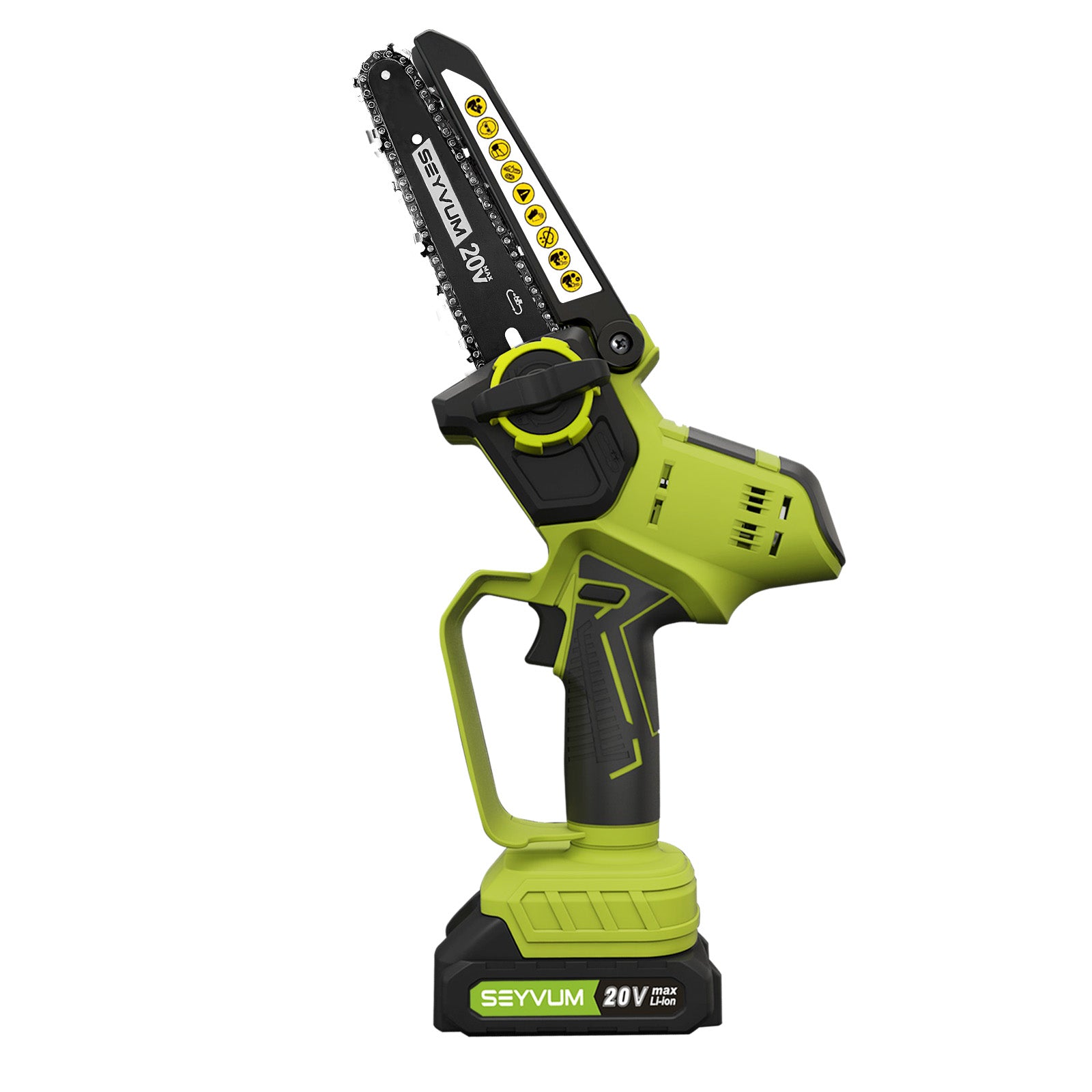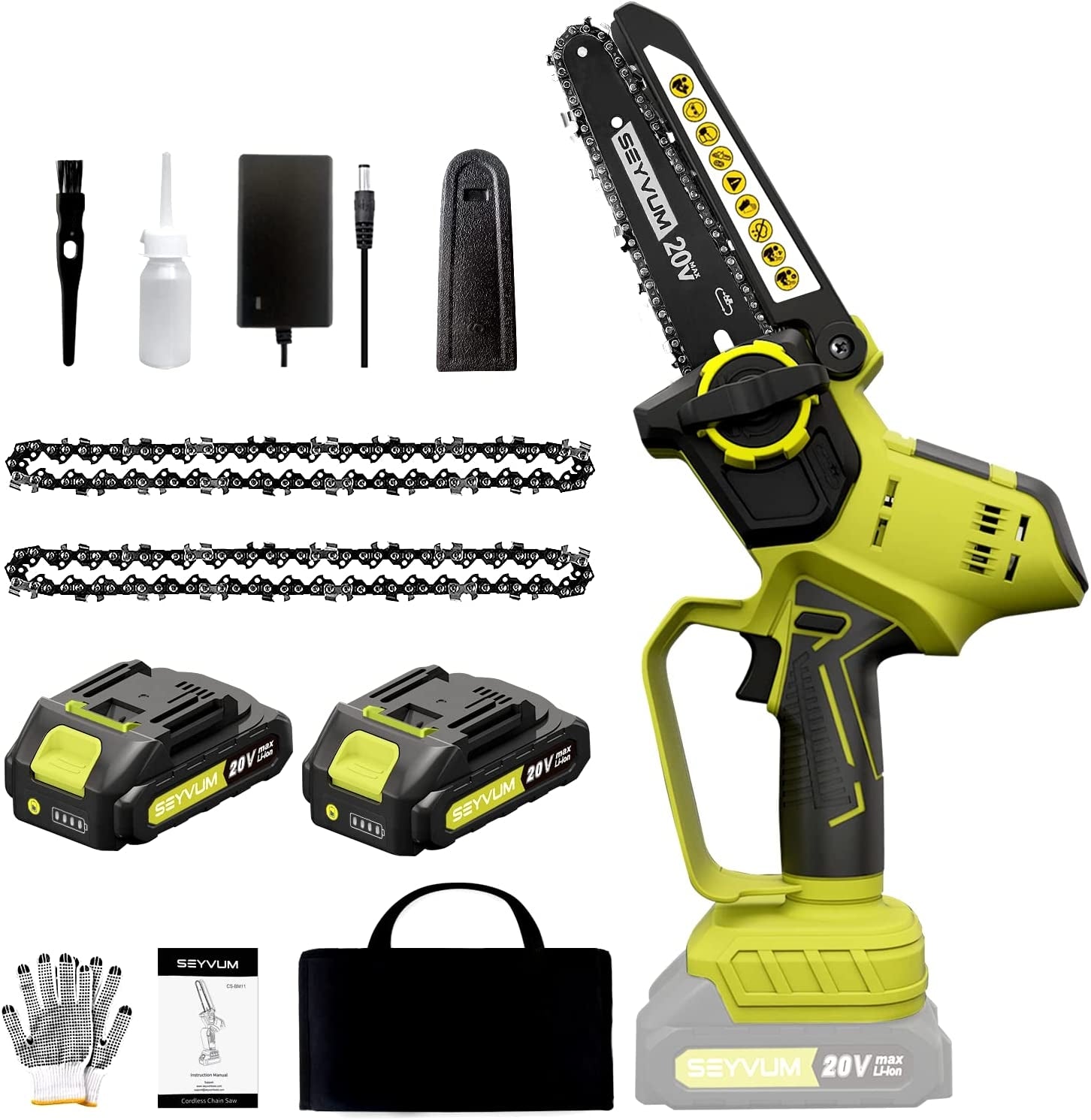 You will get everything you need in this kit, including 1 X Mini Chain Saw, 1 X Guide Plate Blade, 2 X Chains (One is Already Installed), 1 X Guide Plate Cover, 2 X 2.0Ah Battery, 1 X Charger, 1 X Oil Bottle (Oil Not Included), 1 X Oil Brush, 1 X Protect Gloves, 1 X User Manual, 1 X Carrying Storage Bag. It’s an especially great choice for those who already have other SEYVUM 20V power tools, and already have a collection of compatible batteries.