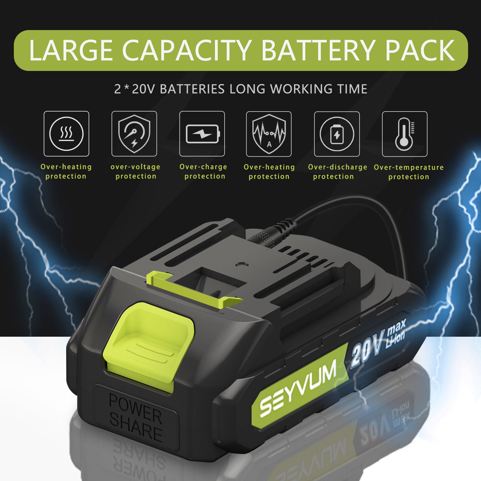 SEYVUM Cordless chainsaw is equipped with 2 X 20V voltage and 2000mAh high capacity battery packs, can provide much longer battery life and more power, continuous use time of about 60 minutes. That's more than enough time to make around 40 cuts in branches (≈10cm). Charging time only takes 2 hours. Thoughtfully equipped with a 1 pcs replacement battery, you can use it outside without any worries, portable and has low energy consumption.