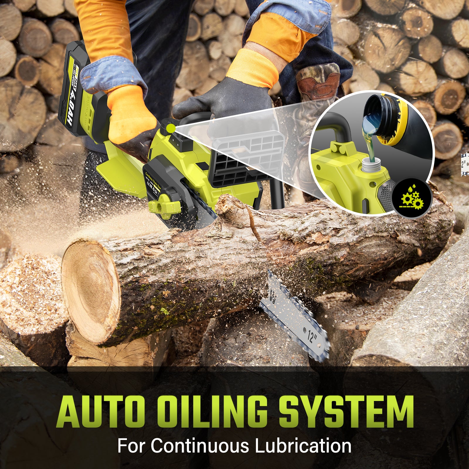 SEYVUM 12” Mini Chainsaw, Electric chainsaw with Tool-free Chain Tension, Includes Two 4.0Ah Battery & Charger, Ideal for Tree Felling, Branch Trimming and Pruning