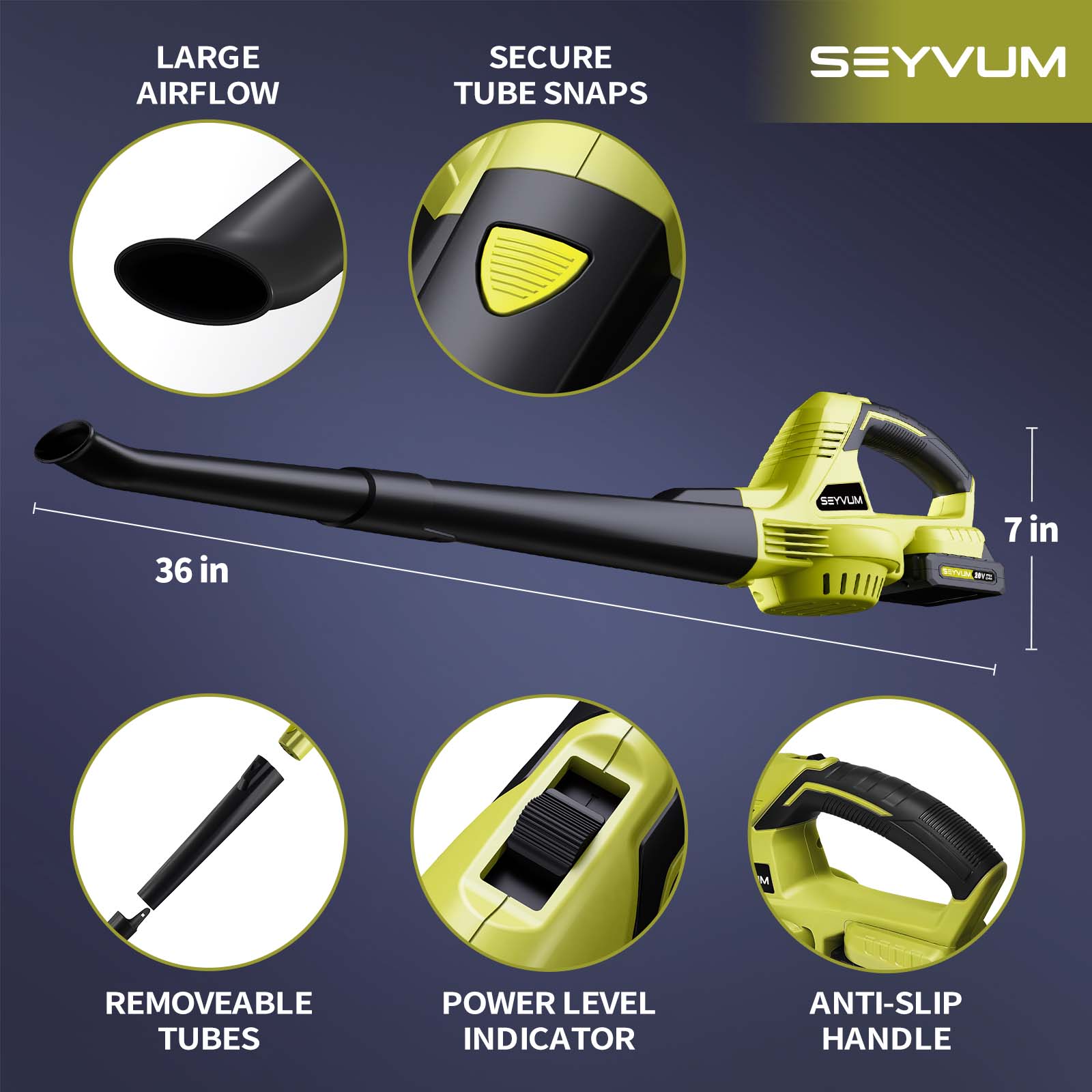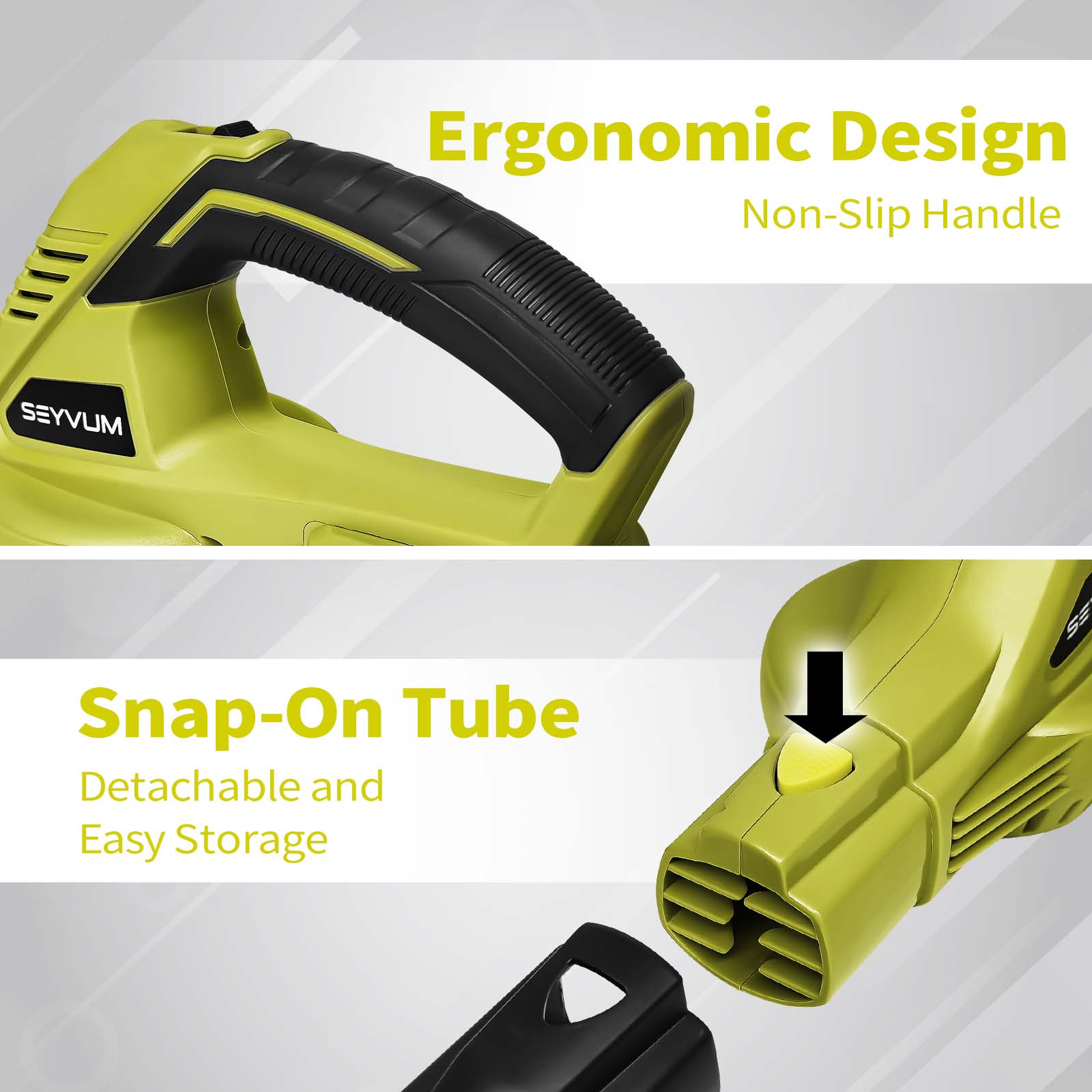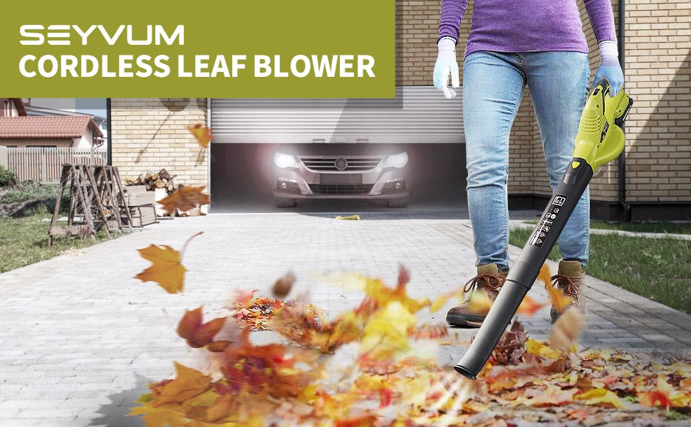 SEYVUM understand customer’s needs of the house working tool; The body of this cordless leaf blower weighs less than 2.7 lbs, and you can easily lift it with one hand; Not only that, our grip is made of flexible rubber material, which is non-slip and comfortable; The 2-section tube design allows you to use this product while standing or sitting; Start with SEYVUM leaf blower and refresh your house working experience.