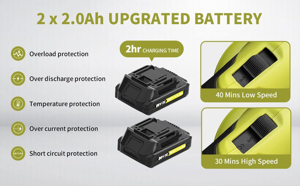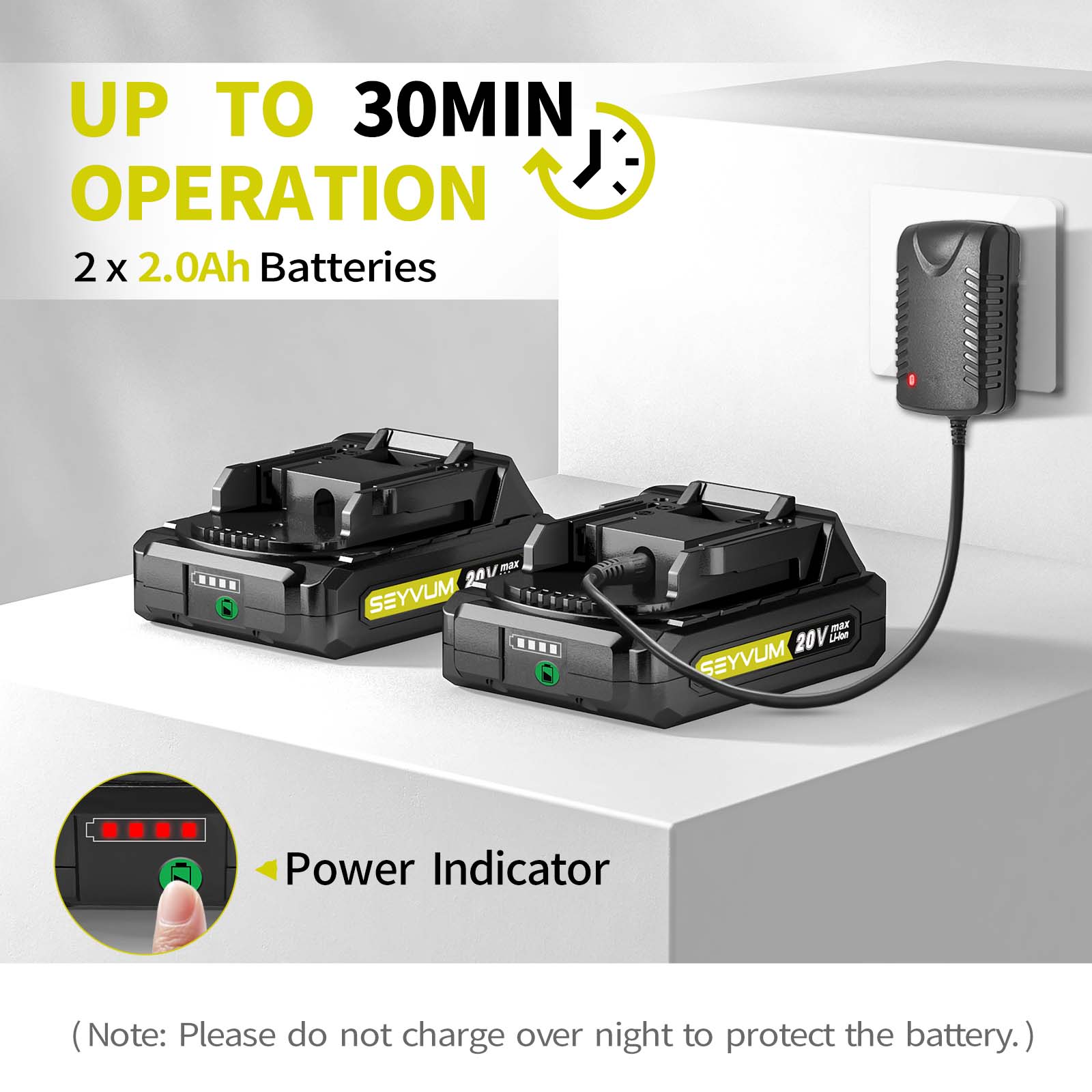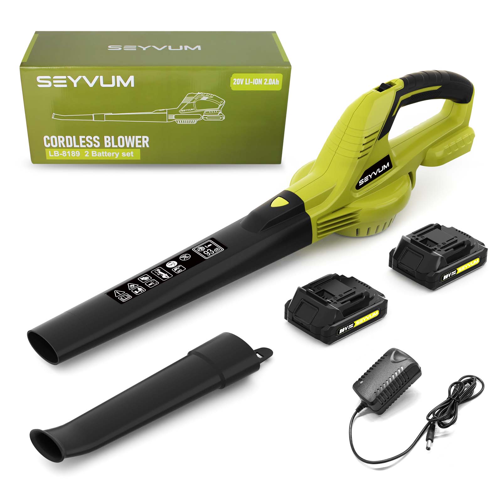 SEYVUM This cordless leaf blower with battery provides you with a 1-stop solution. We provide you with ‘1 bare tool + 2 2.0Ah lithium battery + 1 fast charger’ at one time; This electric leaf blower is equipped with the fast charge technology so that the battery can be fully charged in only 2 hours; The total working time can last for 30 mins (High Speed) & 40 mins (Low Speed).