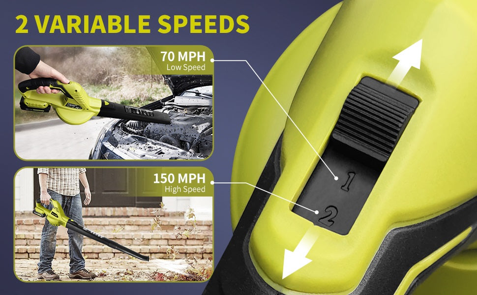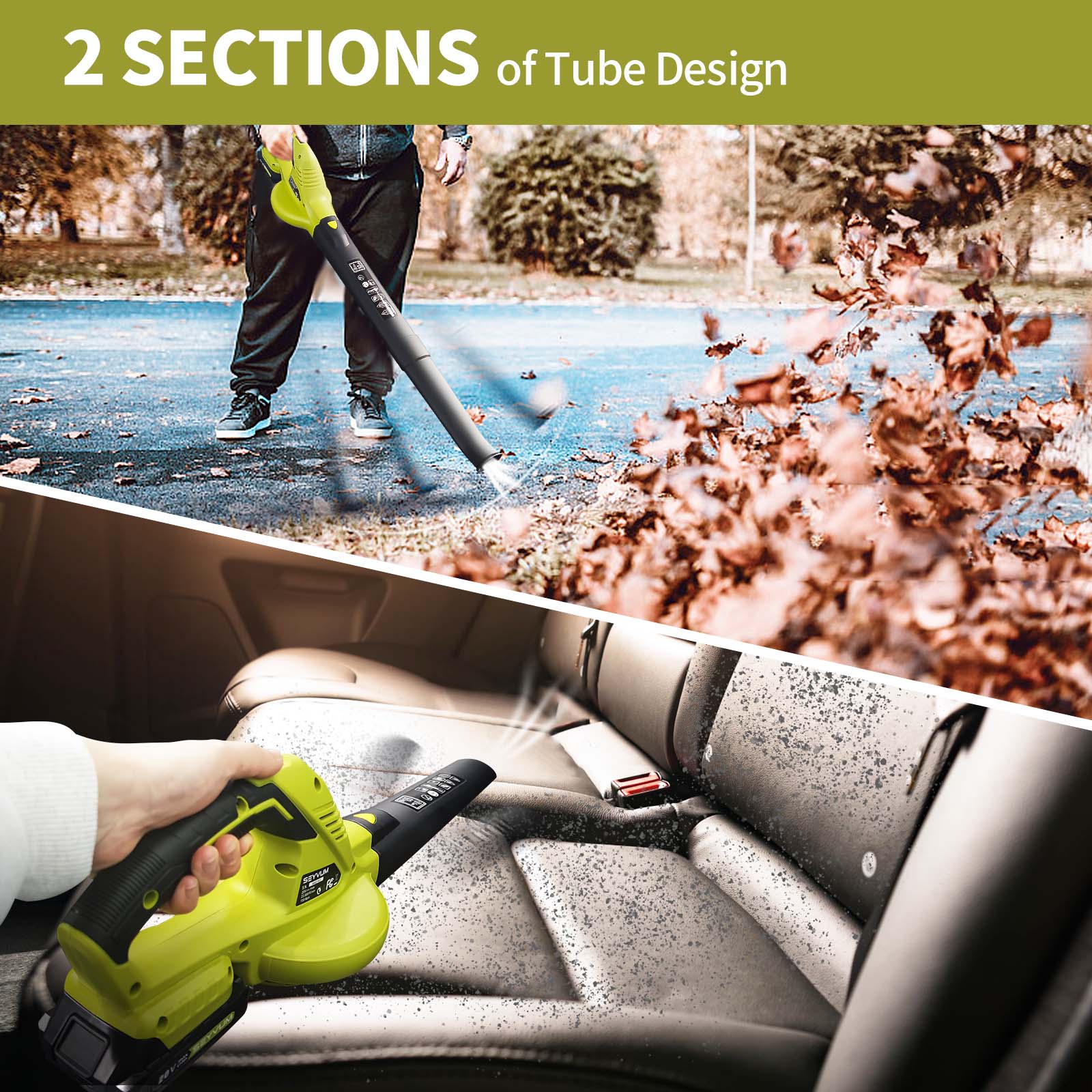 This battery-powered leaf blower provides you with 2 levels of adjustable speed; The high-speed mode has an average no-load speed of 150mph, and the low-speed mode has an average no-load speed of 70mph. SEYVUM leaf blower battery powered, suitable for all usage scenarios. could help you easily convert from indoor work to outdoor work; With adjustable blowing tubes, people of all heights would find out a comfortable using experience.