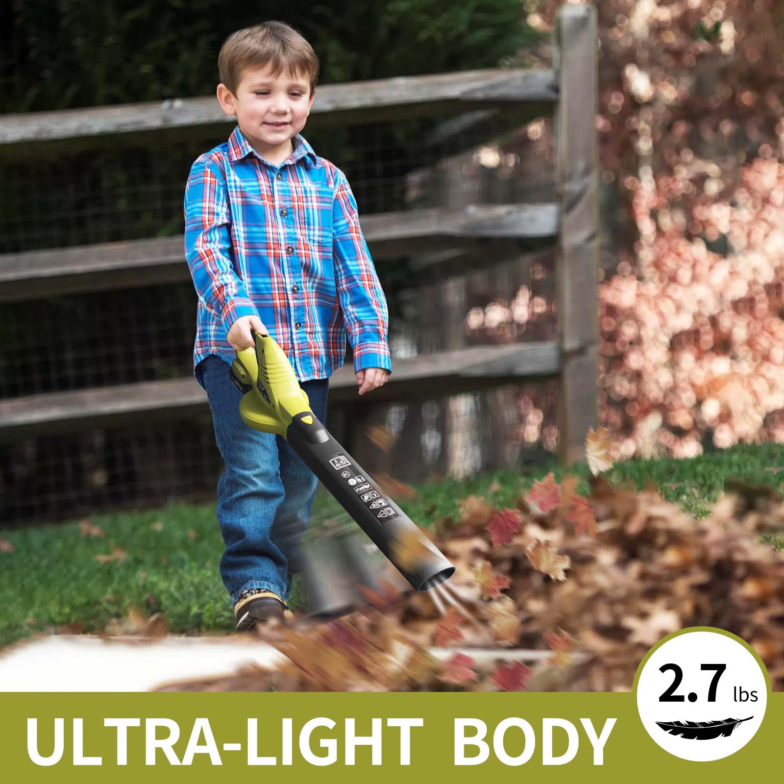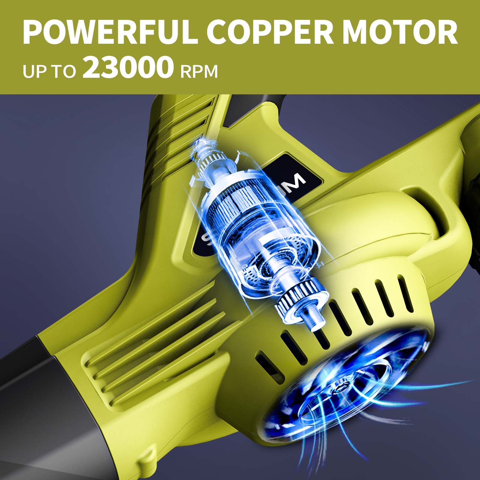 This leaf blower is equipped with a copper motor, which has a longer-lasting life and lowers energy consumption than ordinary motors; also, the SEYVUM cordless leaf blower with battery and charger uses turbocharging technology to deliver a maximum air volume of 150 MPH. Meanwhile, the cellular radiator design at the bottom effectively reduces the risk of overheating- safer and is more durable.