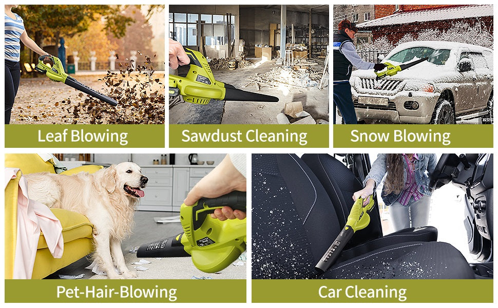 Sweeps debris from shops, garages, driveways, outdoor yards, and gardens fell wet leaves or cleared hard-to-reach surfaces. SEYVUM home dryer blower can also effectively remove snow, dust, debris, and spider webs, and dry your car surface. This cordless blower can be assembled in 1 minute, and all parts are clear at a glance; All functions are controlled with 1 button, and you can get started when you receive it.