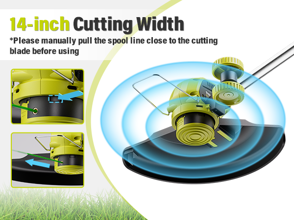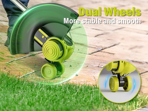 The cordless string trimmer is easy to convert from string trimmer to wheel edger, meet your multiple needs; Double wheels is more stable and smooth when edging