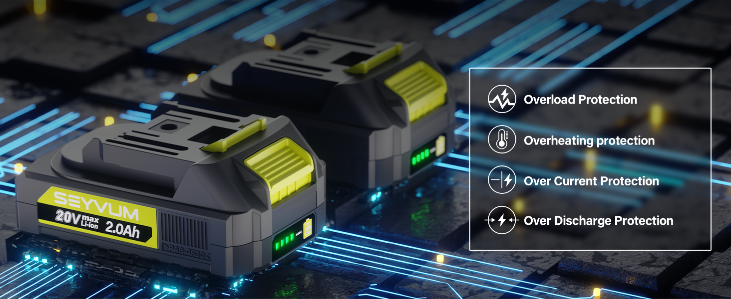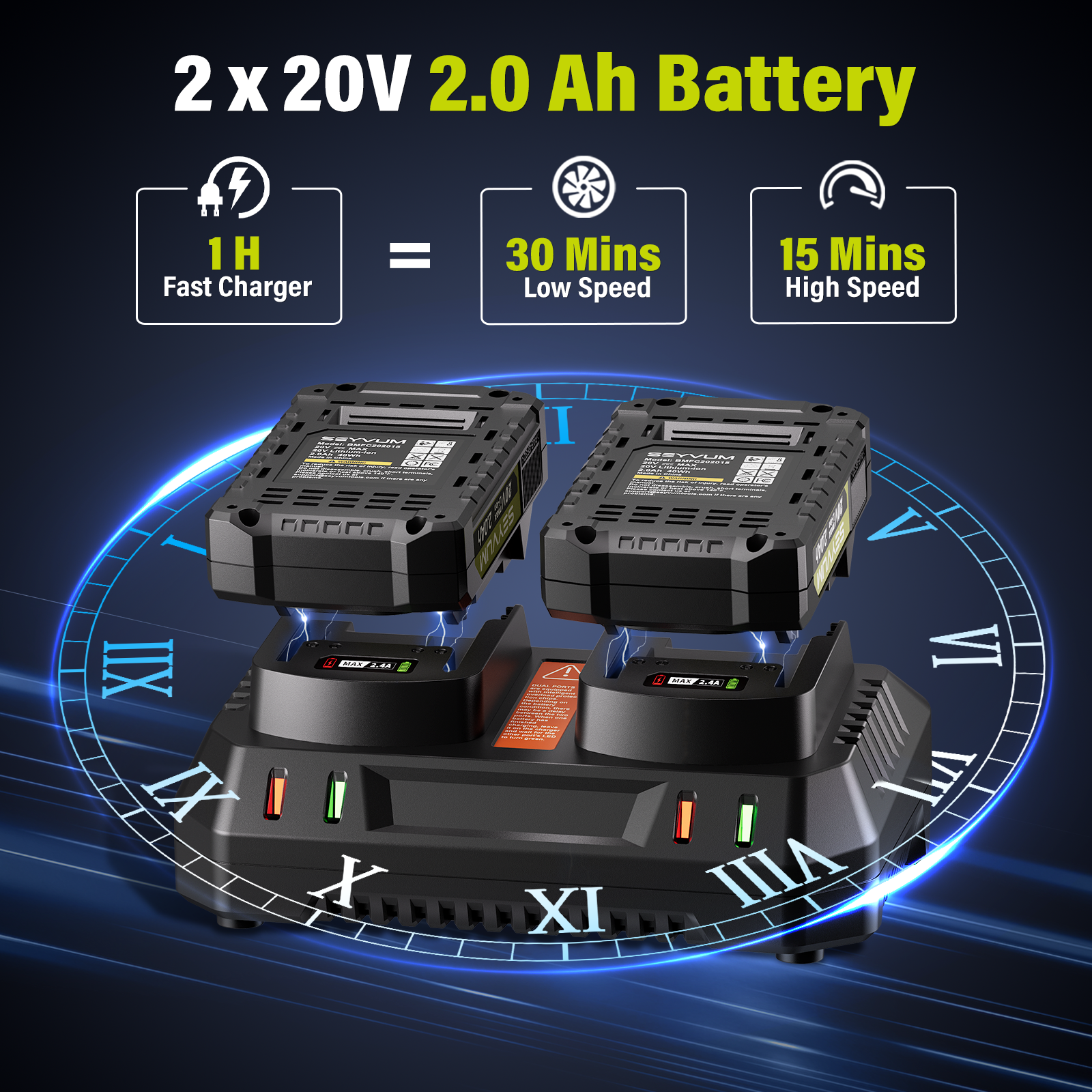 Press the ECO button to switch Low & High Speed; With 2 pieces 20V 2.0Ah Battery, the working time is up to 30 minutes in low speed and 15 minutes in high speed; The SEYVUM battery powered lawn edger also comes with 1 hour fast charger; Please make sure the battery is cool before charging