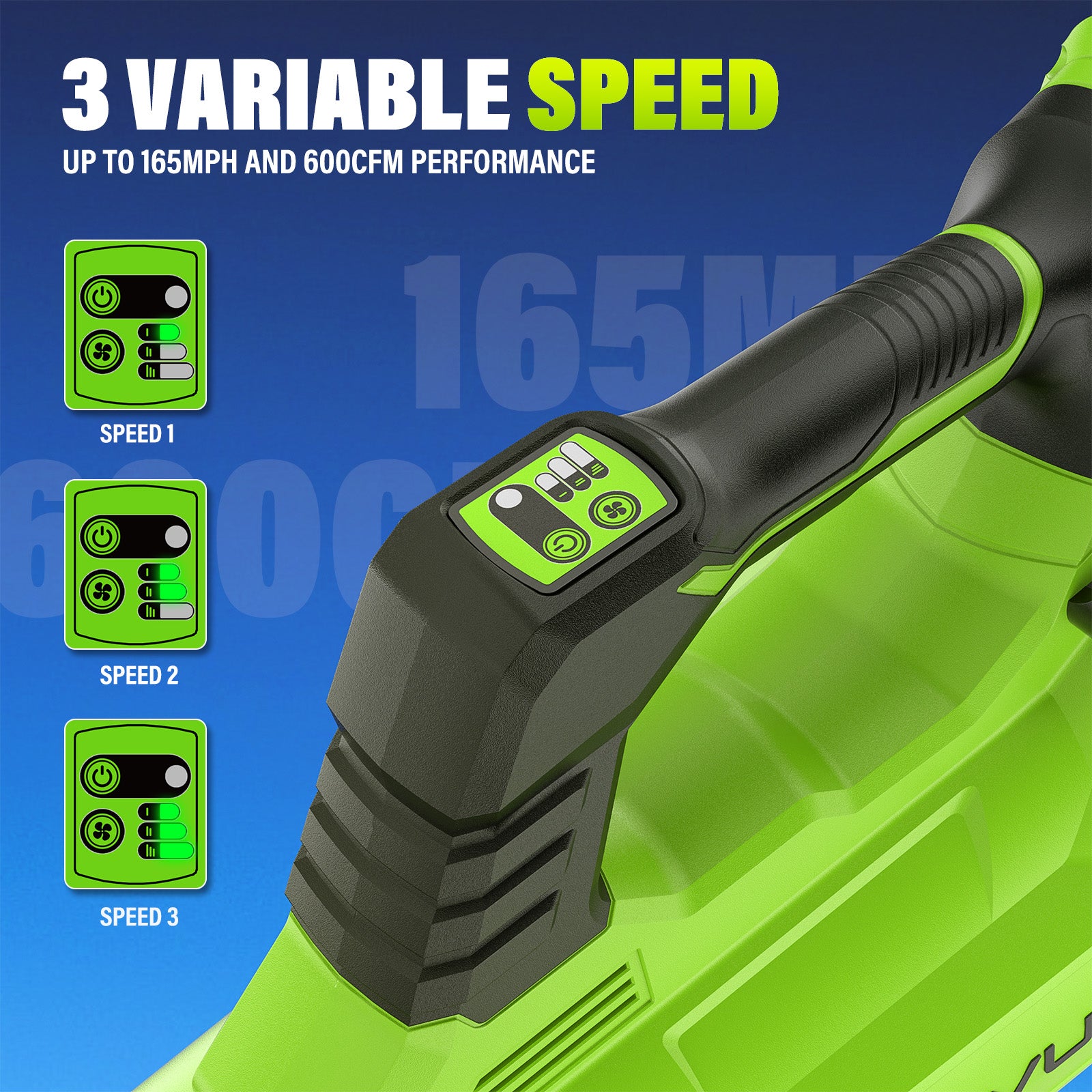 Equipped with a cutting-edge 40V motor and axial-flow fan technology, this cordless leaf blower delivers a powerful 600 CFM air volume and 165 MPH wind speed. This significant power boost over traditional 20V models enhances work efficiency and user experience.
