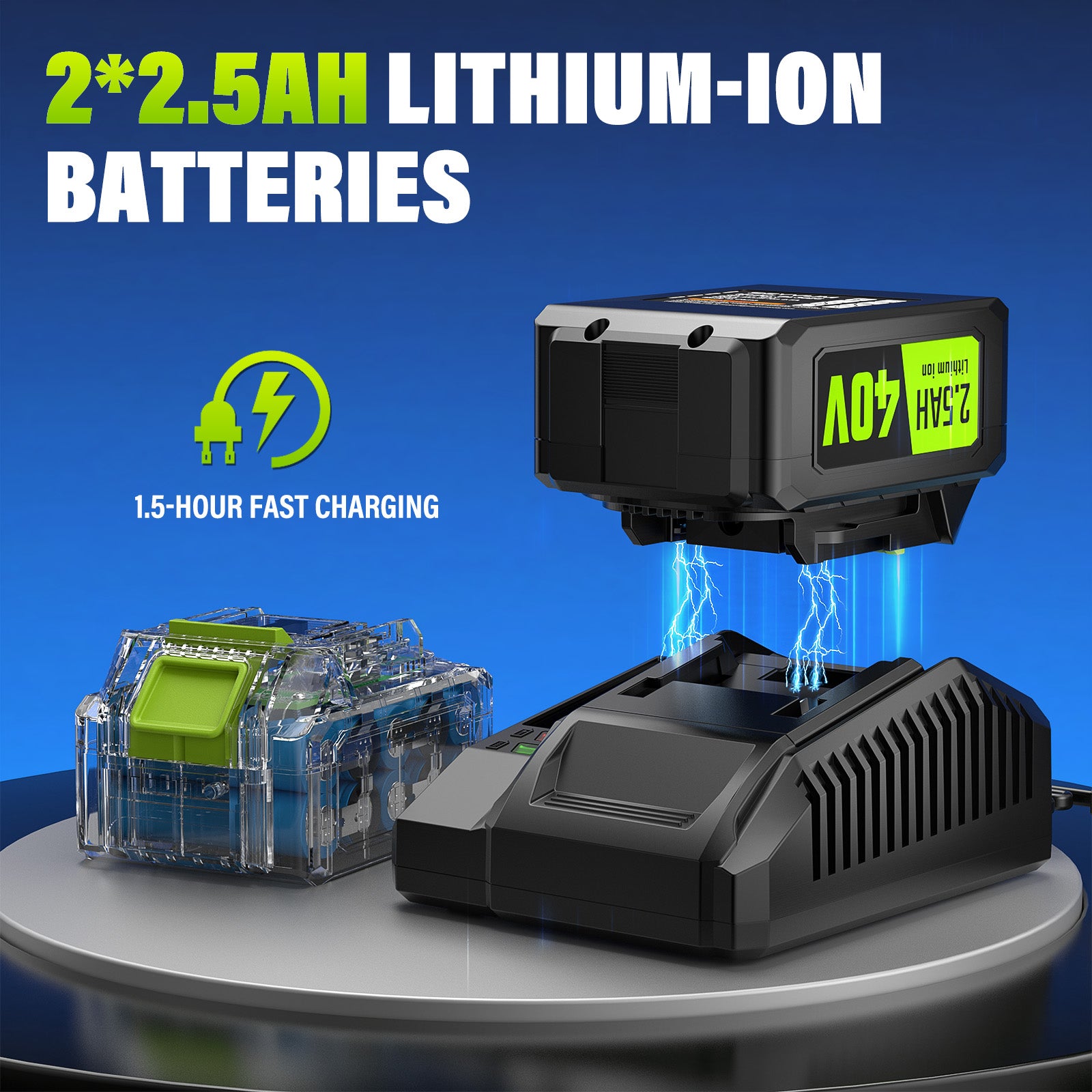 Powered by two 40V 2.5Ah batteries, this electric leaf blower delivers exceptional performance and a long-lasting 150-minute runtime. The included 1.8A fast charger ensures quick recharging in just 1.5 hours.