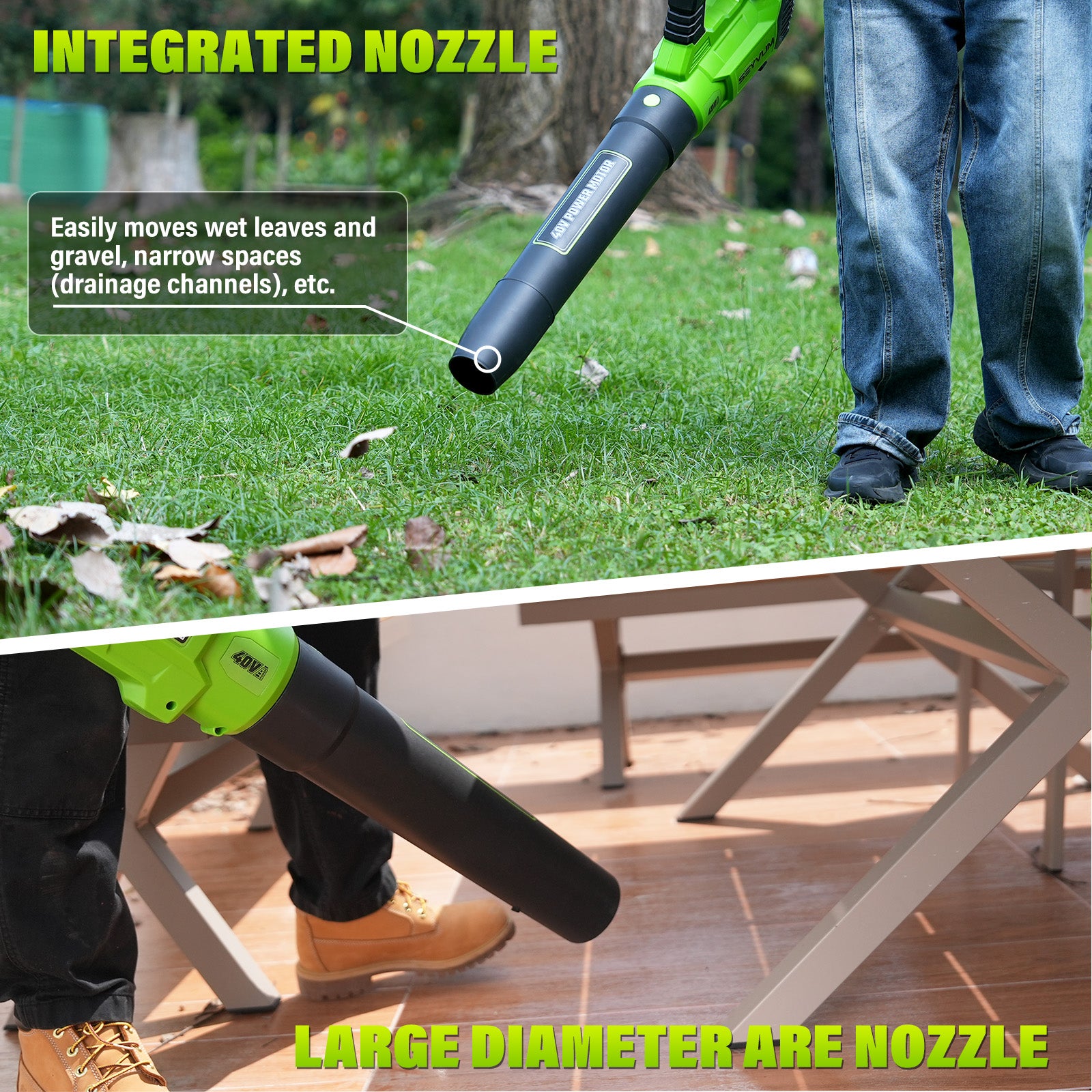 The 40V blower offers two versatile nozzles: a tapered nozzle for focused, high-pressure airflow ideal for removing stubborn debris or working in tight spaces, and a large-diameter nozzle for efficient cleaning of larger areas like lawns and driveways.