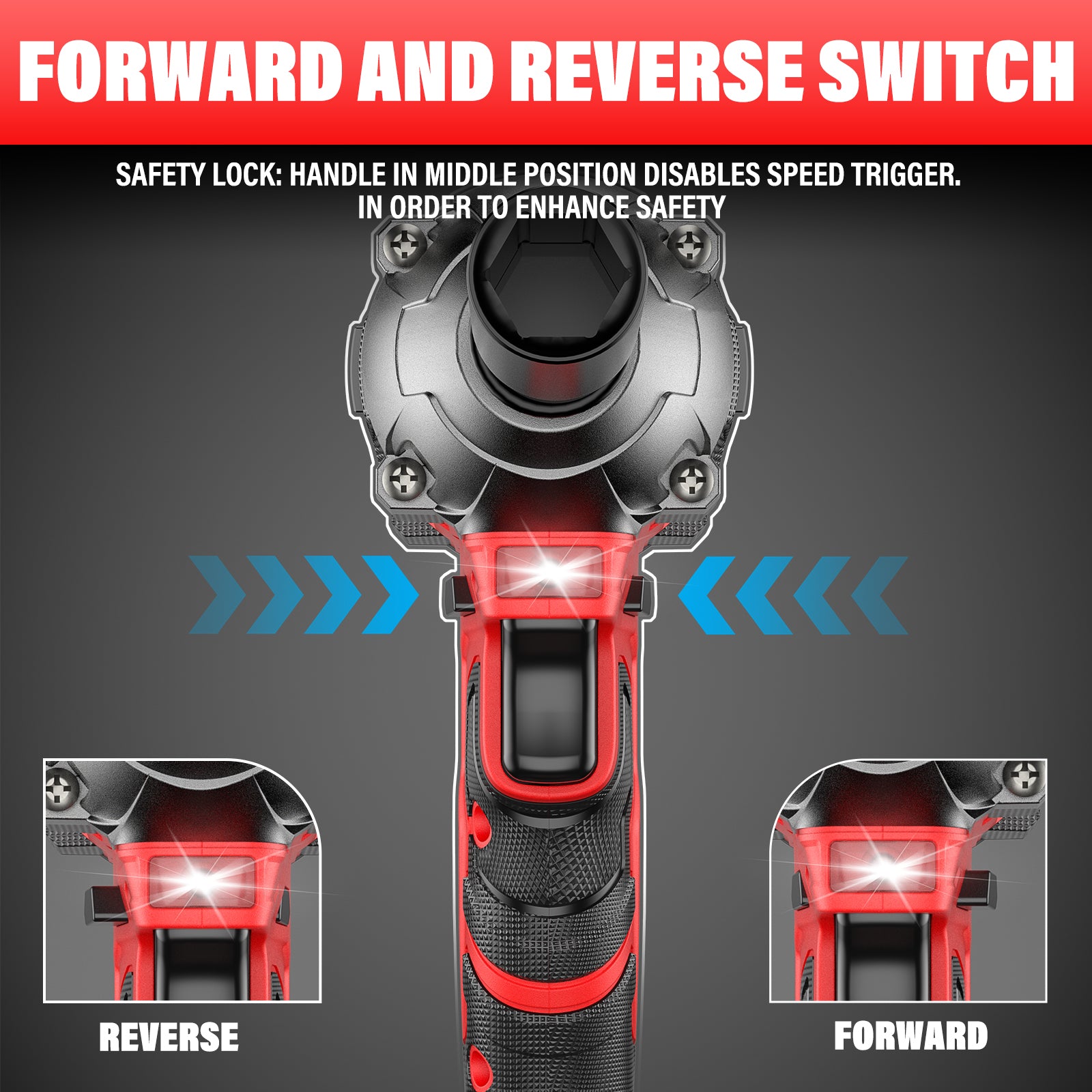 The forward and reverse buttons allow you to easily switch the rotation direction. For added safety, a middle position on the button activates a safe mode. This 1/2-inch impact wrench offers two speed settings: 0-2500 RPM and 0-3000 RPM, allowing you to adjust the speed based on your specific needs.