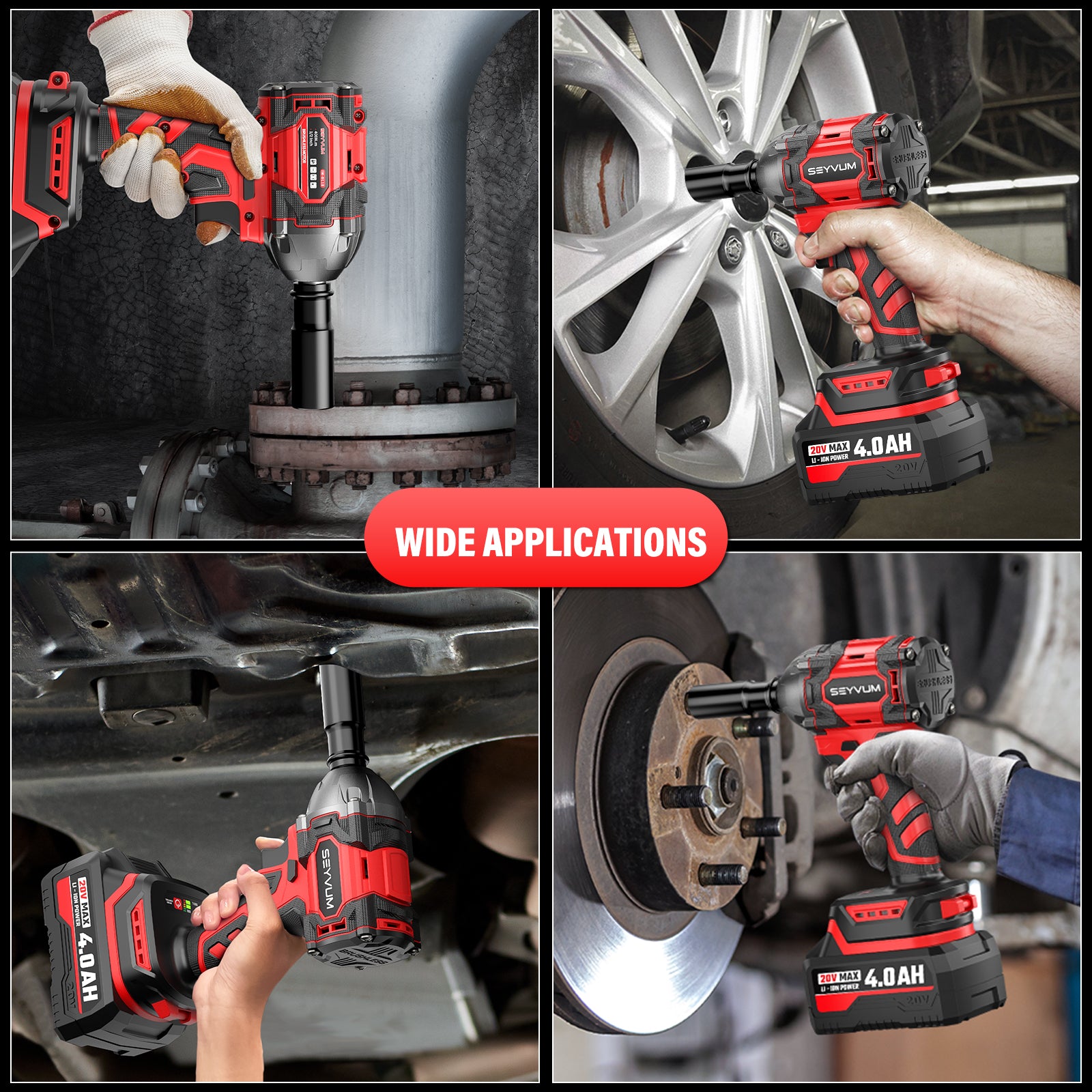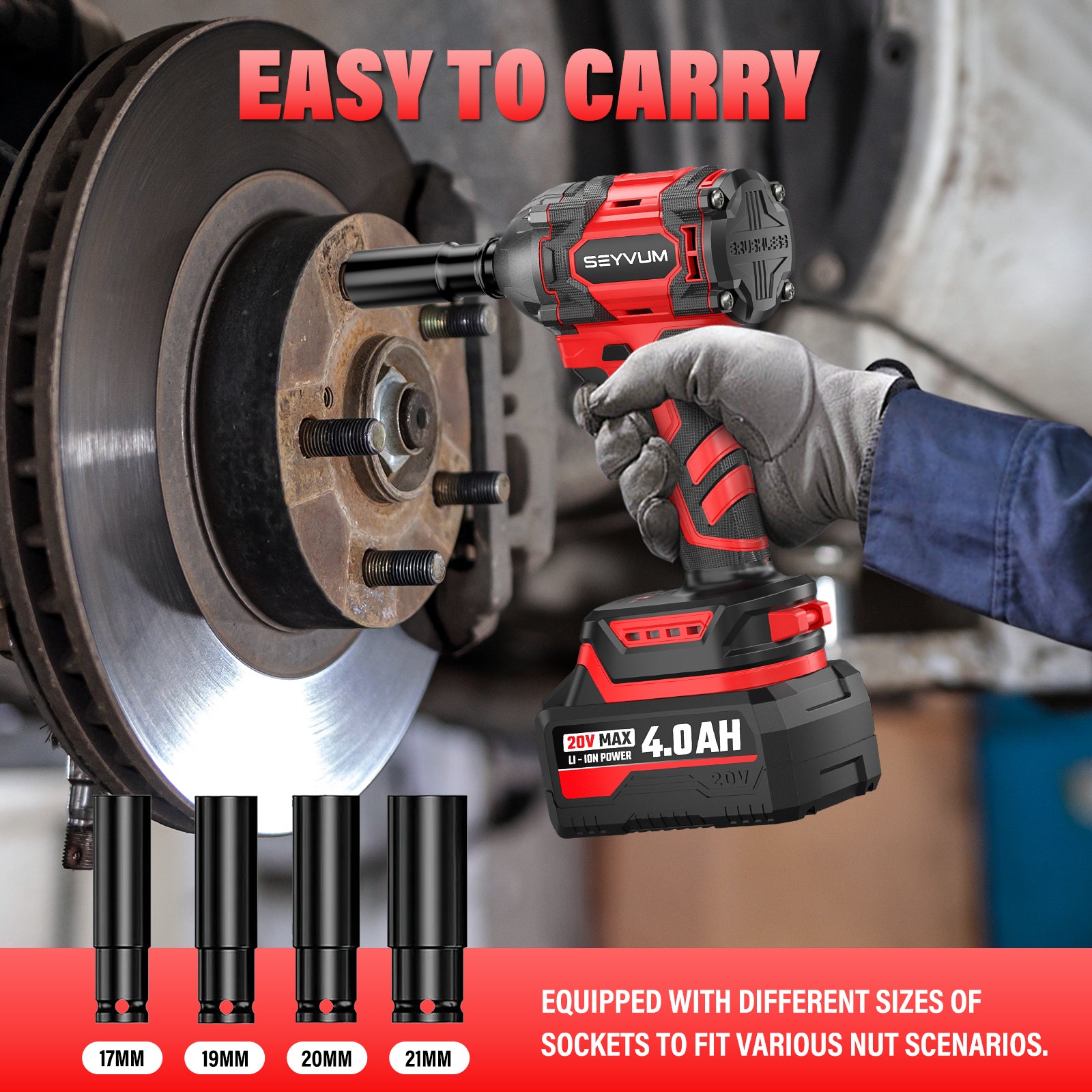 SEYVUM Cordless Impact Wrench, 20V Compact Brushless 1/2 Inch Impact Driver with 4.0Ah Lithium-Ion Battery and Fast Charger, 350 Ft-lbs(475 N.m) with 4 Pcs Sockets, Electric Impact Wrench for Car Hom