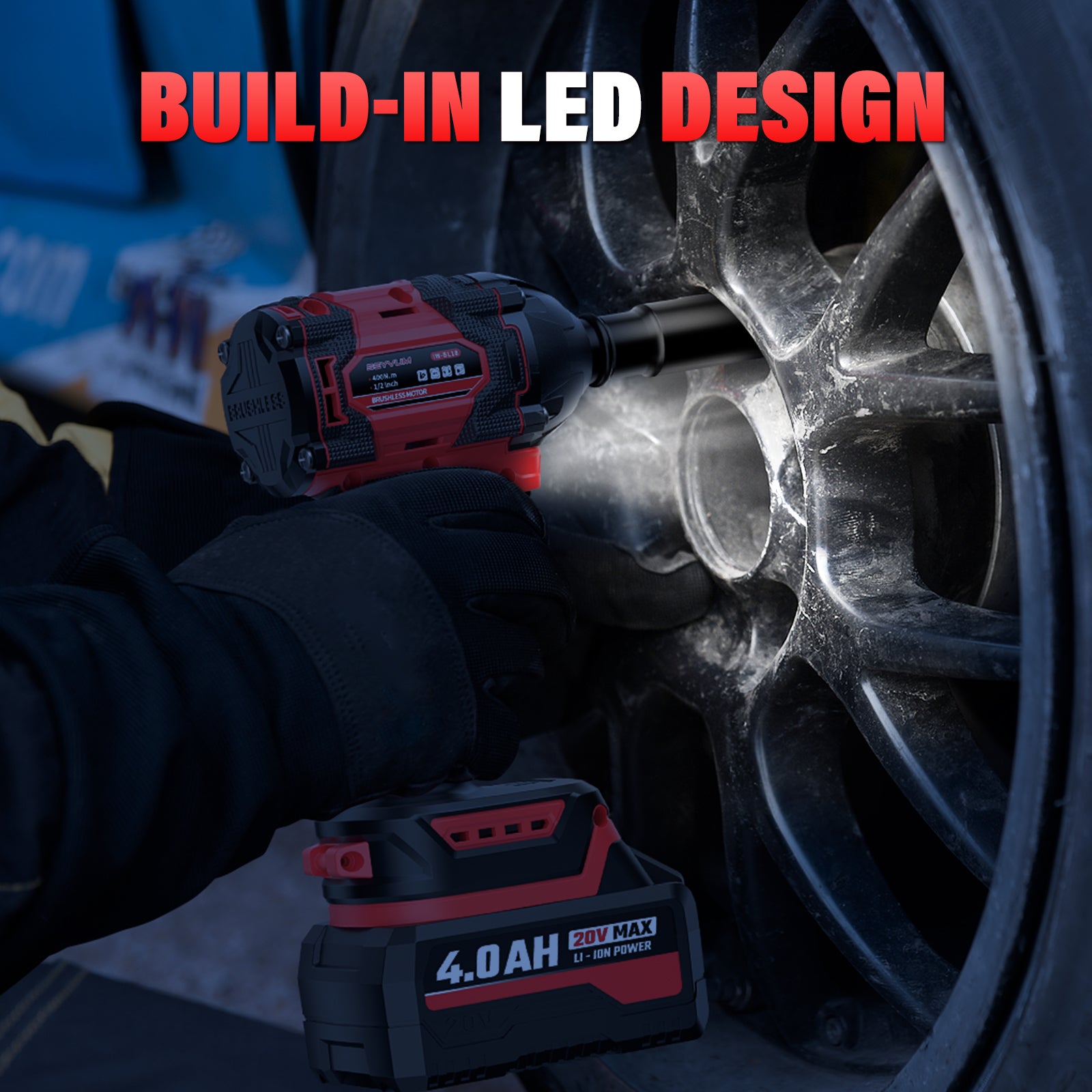 This impact wrench is powered by a brushless motor and provides a maximum torque of 350 ft-lbs (475 Nm). The cordless impact wrench effortlessly loosens or tightens various types of bolts or nuts, including removing car tires, assembling furniture, installing scaffolding, garage use, DIY projects, etc.