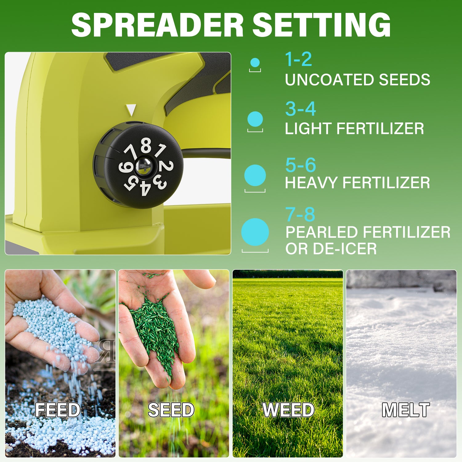 With a wide opening, you can add your favorite seeds, salt, fertilizer and so on. Powerful motors provide more power. Make the material spread more evenly and quickly.